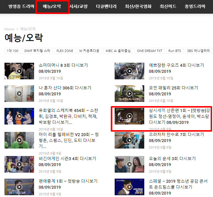 해당 사이트로 접속하시면 메인 화면에 예능/오락 메뉴가 보입니다. 이 예능/오락 메뉴를 눌러서 들어가면 현재 방송중은 예능 프로그램들이 업데이트 되어 있습니다.
