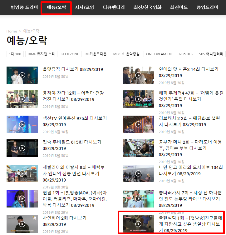 알려드린 사이트로 들어가시면 화면에 메인 메뉴에서 예능/오락 메뉴로 들어가시면 현재 예능프로그램들이 업로드 되어 있습니다. 해당 프로그램은 페이지 중간 쯤에 업로드되어 있습니다. 1페이지에 해당 프로그램이 보이지 않으시면 페이지를 넘기시면 보실 수 있습니다.