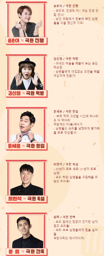 송은희, 황광희, 문세윤, 김신영, 최현석쉐프가 출연하며, 극한식탁’은 제한시간 안에 아내 취향 저격 요리를 완성 해야 하는 남편들의 예측불가 요리쇼. 매회 두 쌍의 부부가 출연하며 두 명의 남편이 제한시간 내 아내를 위해 주어진 미션 푸드를 완성하는 일대일 대결을 펼칩니다