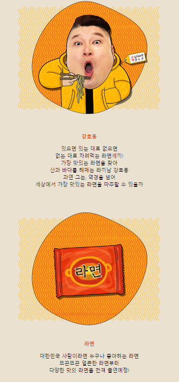 프로그램 소개 - 전국방방곡곡 가장 맛있는 라면 찾아 해가 지고 뜰 때까지 끼리 먹는 전설의 육봉선생의 금강산도 식후경 라이프. 라면 끼리는 남자. 라끼남!