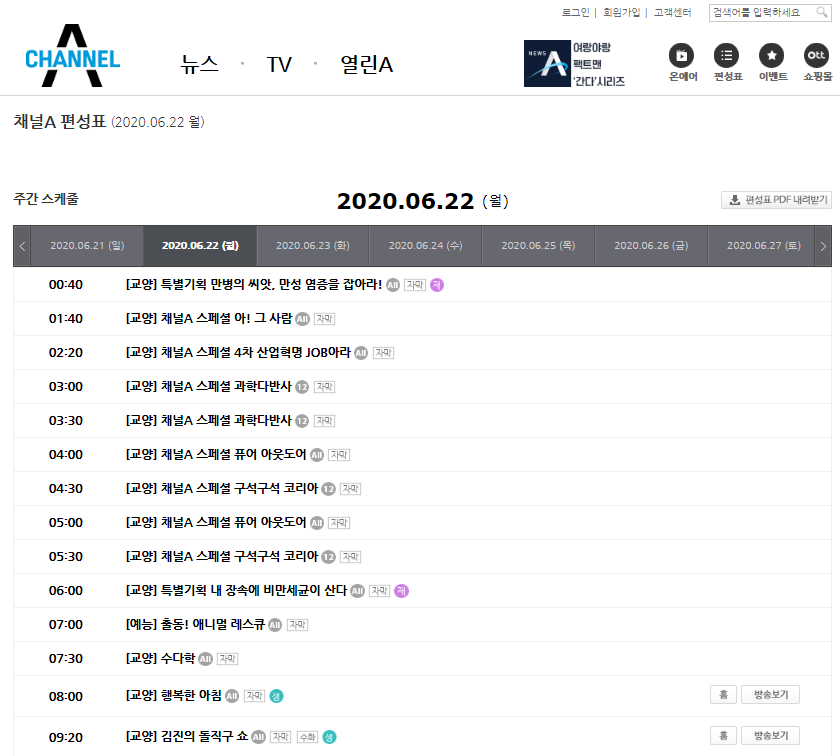 채널A 메인에서 메뉴로 들어가면 편성표 메뉴가 나옵니다. 편성표를 확인해 시청하고 싶으신 프로그램 시간을 알아 두셨다가 바로 시청 하시면 됩니다.