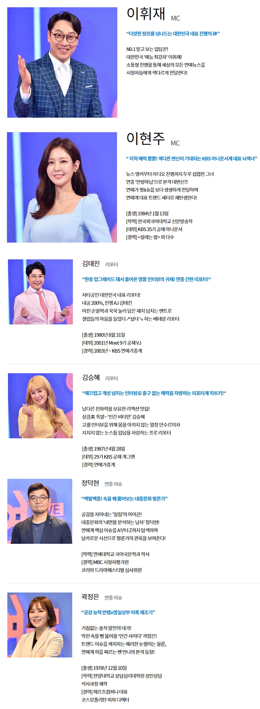 출연진 - 이휘재, 이현주, 김태진, 김승혜, 정덕현, 곽정은