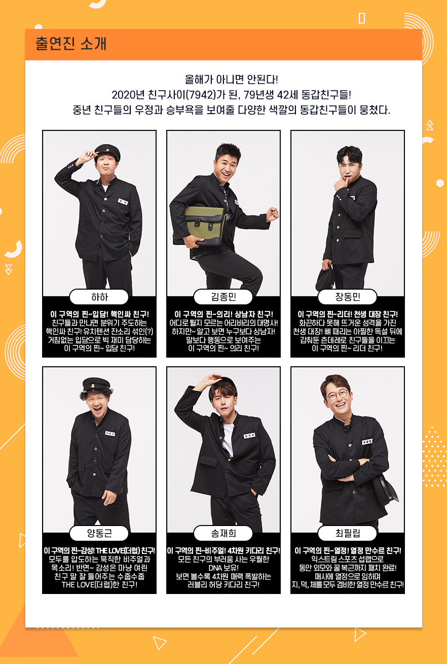 인생 20년을 야외형 버라이어티에 바친 하하와 김종민, 톱클래스 독설가 장동민, 예능 늦둥이 양동근과 송재희, 최필립까지 출연하며, 그 어떤 프로그램에서도 볼 수 없었던 조합입니다. 공통점이라면 모두 1979년생, 42세 동갑내기 스타들이라는 점. 친구라서 편하고, 막대할 수 있어서 아슬아슬한 6인이 수요일 밤을 책임집니다.