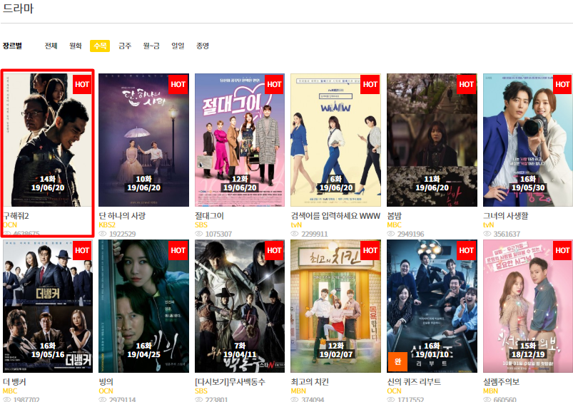 메인 페이지로 접속하면, 카테고리 메뉴에서 드라마 메뉴로 다시 들어갑니다. 드라마 메뉴에서 수목메뉴로 들어가면 현재 방송되고 있는 수목 드라마들이 업로드 되어 있는 걸 보실 수 있습니다. 현재 해당 드라마는 1페이지에 상단에 위치해 있으며, 해당 드라마가 업데이트 되는 수요일, 목요일에는 1페이지에 업데이트 됩니다.