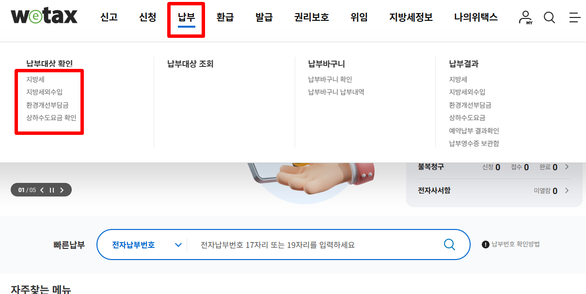 - ‘조회/납부’ 메뉴 선택