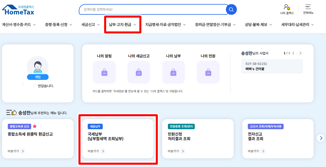 - 상단 메뉴에서 ‘국세납부’ 선택