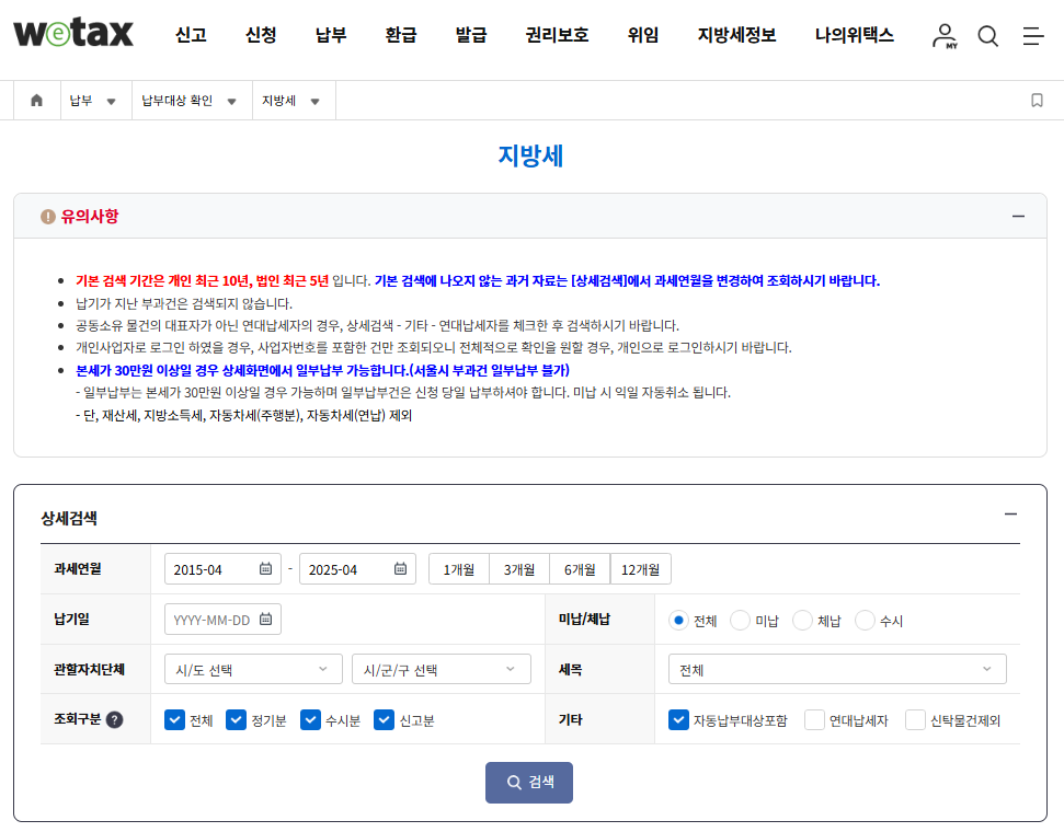 위택스에서는 지방세의 체납 내역을 확인하고, 5년 이상 경과된 세목에 대해 소멸 여부를 체크할 수 있습니다.