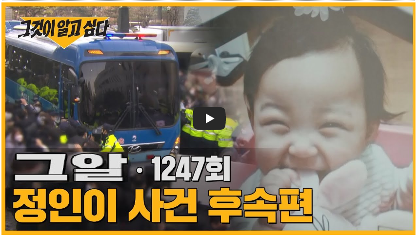 SBS 그것이알고싶다 1247회에서는 '그것이 알고 싶다'에서는 '정인아 미안해, 그리고 우리의 분노가 가야 할 길' 편이 방송됩니다. 이날 방송에서는 신고에도 정인이를 구할 수 없었던 원인을 심층적으로 분석해는데요. 1차, 2차, 3차 신고 과정을 면밀히 들여다보며 또 다른 '정인이 사건'을 막기 위한 대안은 무엇이 있을지 고민해봅니다.