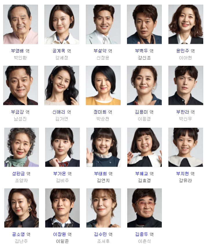남성진은 부영감의 둘째 아들 부금강 역을, 김가연은 부금강의 아내 신애리 역을 연기합니다. 박신우는 부영감의 막내 아들 부한라 역을 맡았습니다.