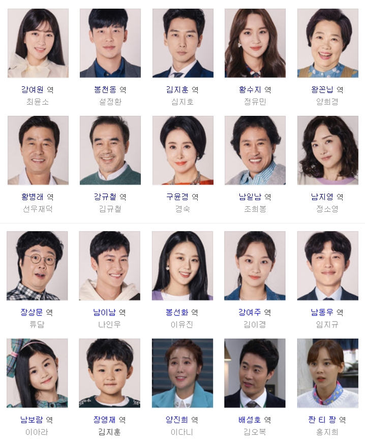 등장인물소개 - 등장인물로는 최윤소(강여원 역), 설정환(봉천동), 심지호(김지훈), 정유민(황수지)을 비롯, 양희경(왕꼰닙), 김규철(강규철), 선우재덕(황병래), 경숙(구윤경), 조희봉(남일남), 정소영(남지영), 류담(장상문), 임지규(남동우) 등 다채로운 개성과 매력을 겸비한 믿고 보는 배우들이 총출동해 안방극장에 신선하고 따뜻한 웃음과 감동을 안겨줄 것으로 기대하고 있습니다.