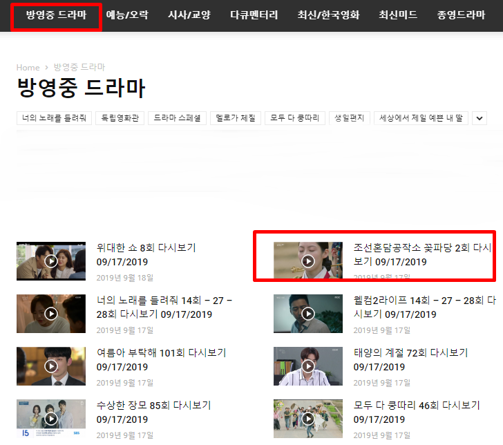 본 사이트 메인 페이지로 접속하면, 방영중인 메뉴가 있고, 이 메뉴로 들어가면 현재 방송되고 있는 드라마들이 업데이트 되어 있습니다.