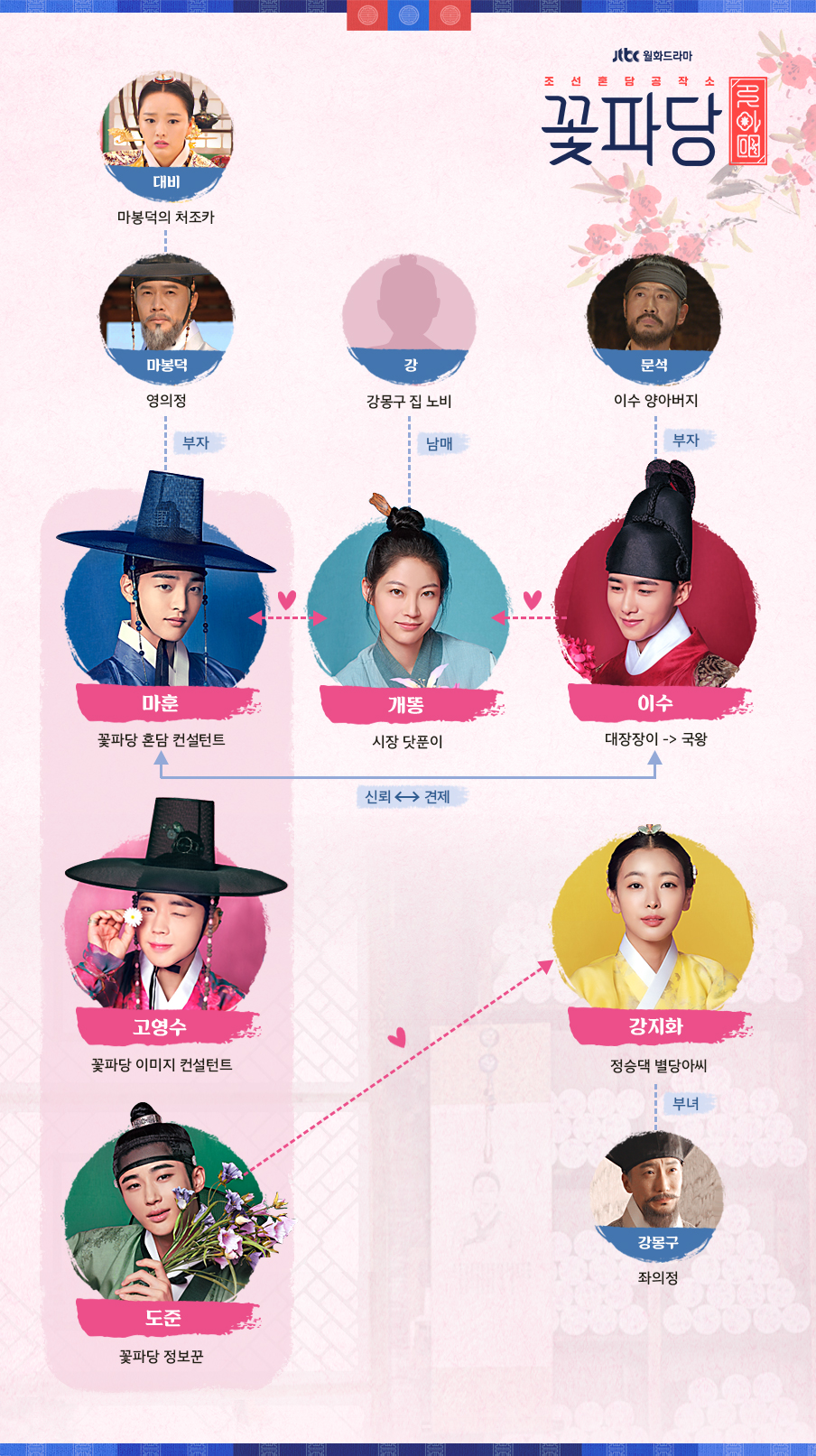 인물 관계도에 따르면 왕의 첫사랑이자 시장의 닷푼이, 꽃파당의 견습생 개똥과 예리한 관찰력을 가진 혼담 컨설턴트 마훈은 서로 사랑하는 사이가 될 것으로 보입니다.
