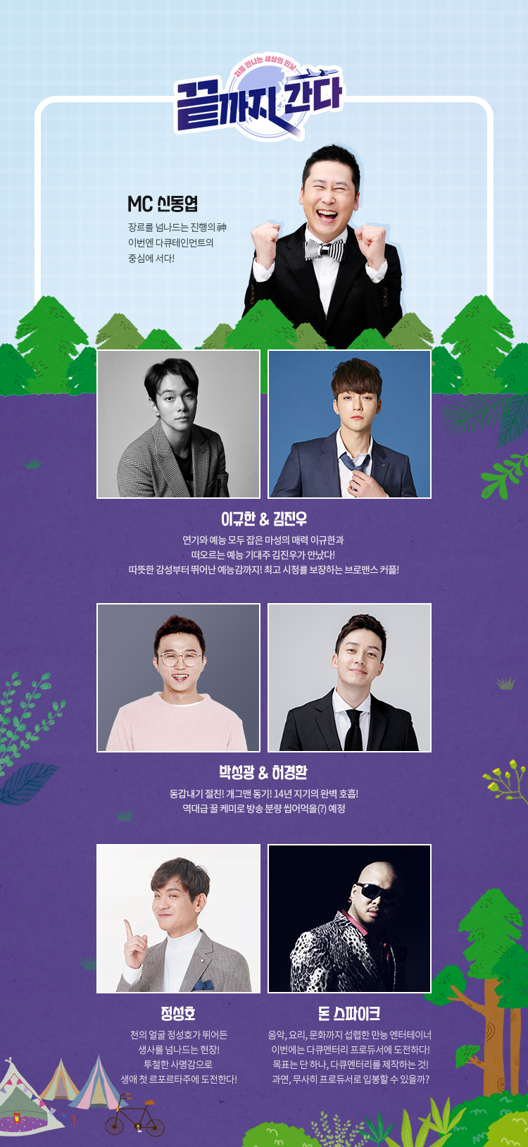 프로그램 소개 - '끝까지 간다'는 세계 곳곳, 신기하고 놀라운 현상과 때로는 드라마보다 더 드라마틱한 다큐멘터리의 현실 상황 속으로 예능인들이 들어가 그 실체를 끝까지 파악하고 직접 체험함으로써, 다큐멘터리가 전하는 신기함과 감동은 물론 예능이 주는 다큐테인먼트 프로그램이다.