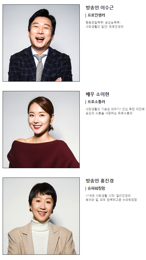 MC들은 어른들의 과거와 현재, 앞으로의 사회생활을 쉽게 이야기합니다. 이수근은 다양한 사회생활 경험을 바탕으로 멘토 역할을 하고, 홍진경은 특유의 밝은 매력으로 재미를 더할 전망입니다. 소이현은 공감 능력을 통해 아이들과 어른들의 사회생활 이야기를 풀어냅니다.