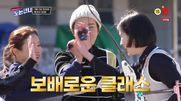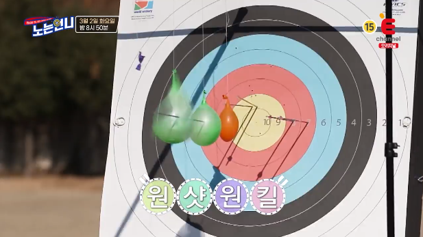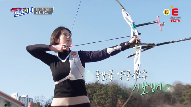 노는언니에서는 양궁 세계 1위 기보배가 출연했는데요. 활을 처음 잡아보는 언니들을 위해서 직접 시범에 나선 기보배는 과녁 앞에 달린 물풍선 세 개를 하나의 화살로 관통시키는 1타 3피의 원샷 원킬로 입을 떡 벌어지게 했습니다. 특히나 퍼펙트 10점으로 과녁 정중앙에 박힌 렌즈까지 꿰뚫어 감탄을 불러일으켰습니다.
