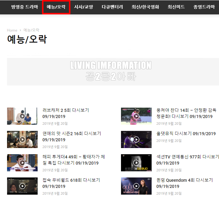 해당 사이트로 접속하시면 메인 화면에 예능/오락 메뉴가 보입니다. 이 예능/오락 메뉴를 눌러서 들어가면 현재 방송중은 예능 프로그램들이 업데이트 되어 있습니다.