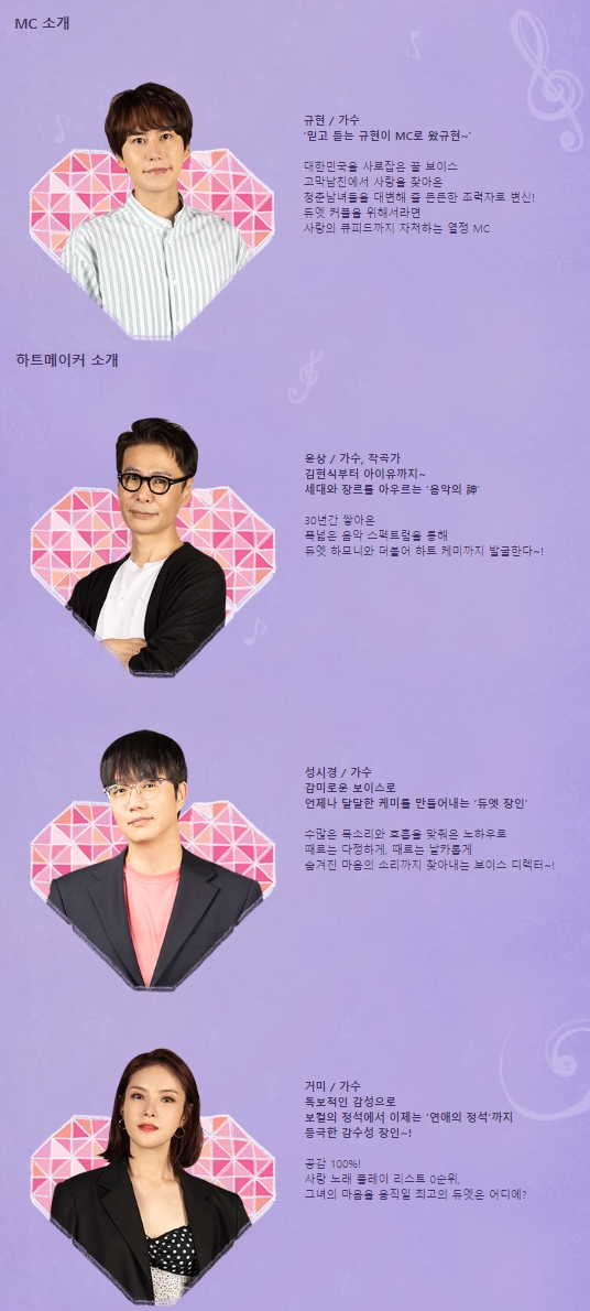 MC로는 슈퍼주니어의 규현이 마이크를 잡고, 하트메이커로는 윤상, 거미, 성시경이 출연합니다.
