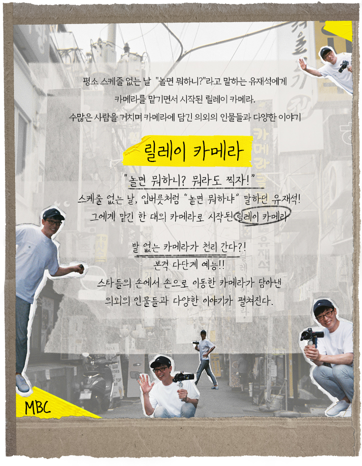 프로그램 소개 - 평소 스케줄 없는 날 "놀면 뭐하니?"라고 말하는 유재석에게 카메라를 맡기면서 시작된 릴레이 카메라. 수많은 사람을 거치며 카메라에 담긴 의외의 인물들과 다양한 이야기