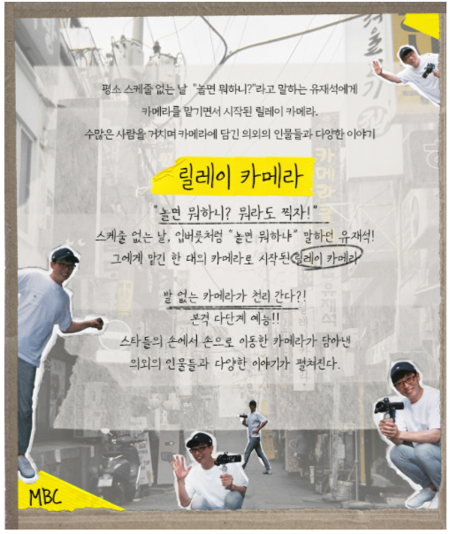 여느 예능프로그램과 달리 ‘놀면 뭐하니?’의 고정출연자는 유재석 단 한명인데요. ‘릴레이 카메라’도 제작진이 유재석에게 두 대의 카메라를 주면서 시작됩니다.