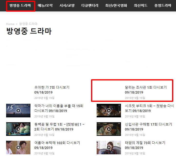 알려드린 사이트 메인 화면을 보시면, 방영중인 드라마 메뉴로 들어가면 현재 현재 방송되고 있는 드라마들이 업데이트 되어 있습니다.