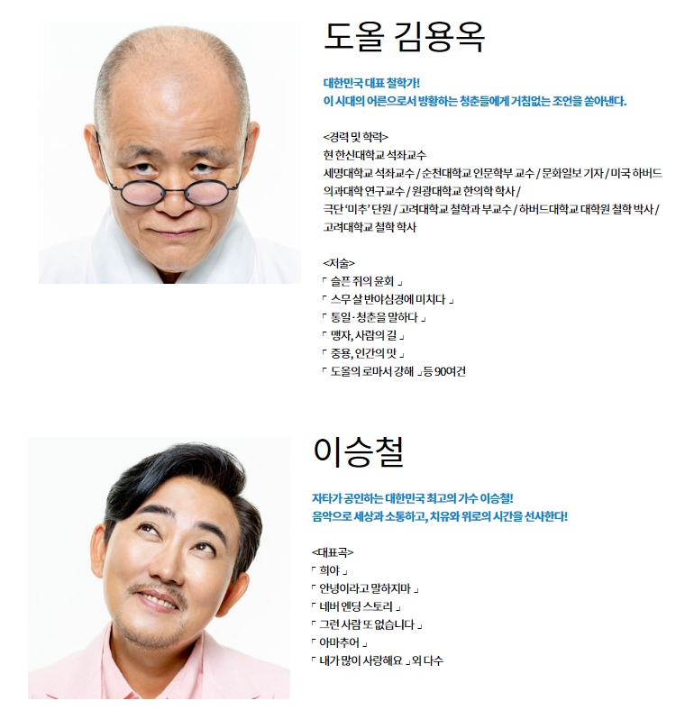 프로그램 소개 - '지금 우리는 잘살고 있는 걸까?' 그 해답을 찾기 위한 신개념 강연토크쇼가 펼쳐진다! 대한민국 최고의 석학 도올 김용옥과 대한민국 최고의 가수 이승철, 그리고 특별한 초대손님이 풀어가는 인생 이야기!