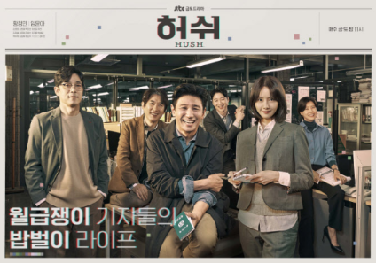JTBC 금토드라마 ‘허쉬'는 큐대 잡는 날이 많은 '고인물' 기자와 밥은 펜보다 강하다는 '생존형' 인턴의 쌍방 성장기이자, 월급쟁이 기자들의 밥벌이 라이프를 그린 드라마입니다.