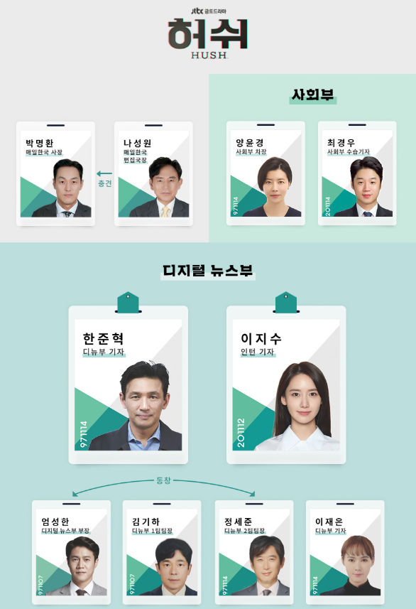 황정민은 '매일한국' 12년차 기자 한준혁 역을 맡았고, 임윤아는 '매일한국' 인턴 이지수 역을, 손병호는 '매일한국' 편집국장 나성원 역을 유선은 '매일한국' 사회부 차장 양윤경 역을 맡았습니다.