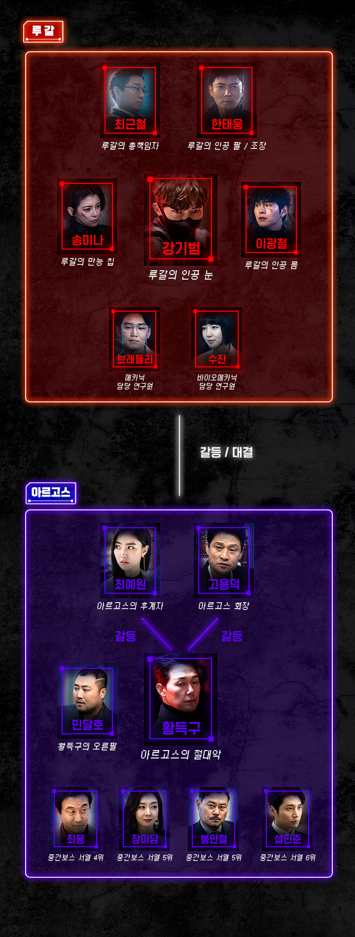 극 중 아르고스의 절대 악 '황득구'역을 맡은 박성웅과 인공 팔을 가진 '루갈' 팀장 '한태웅' 역을 연기하는 조동혁은 차별화된 연기를 예고했습니다.