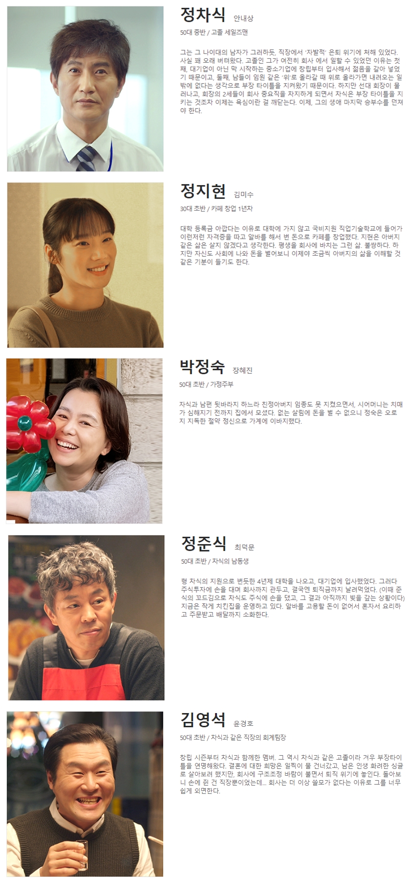 등장인물 소개 - 정차식역에 안내상이 맡았는데요. 그는 그 나이대의 남자가 그러하듯, 직장에서 ‘자발적’ 은퇴 위기에 처해 있었습니다. 사실 꽤 오래 버텨왔다. 고졸인 그가 여전히 회사 에서 일할 수 있었던 이유는 첫째, 대기업이 아닌 막 시작하는 중소기업에 창립부터 입사해서 젊음을 갈아 넣었기 때문이고, 둘째, 남들이 임원 같은 ‘위’로 올라갈 때 위로 올라가면 내려오는 일밖에 없다는 생각으로 부장 타이틀을 지켜왔기 때문입니다.