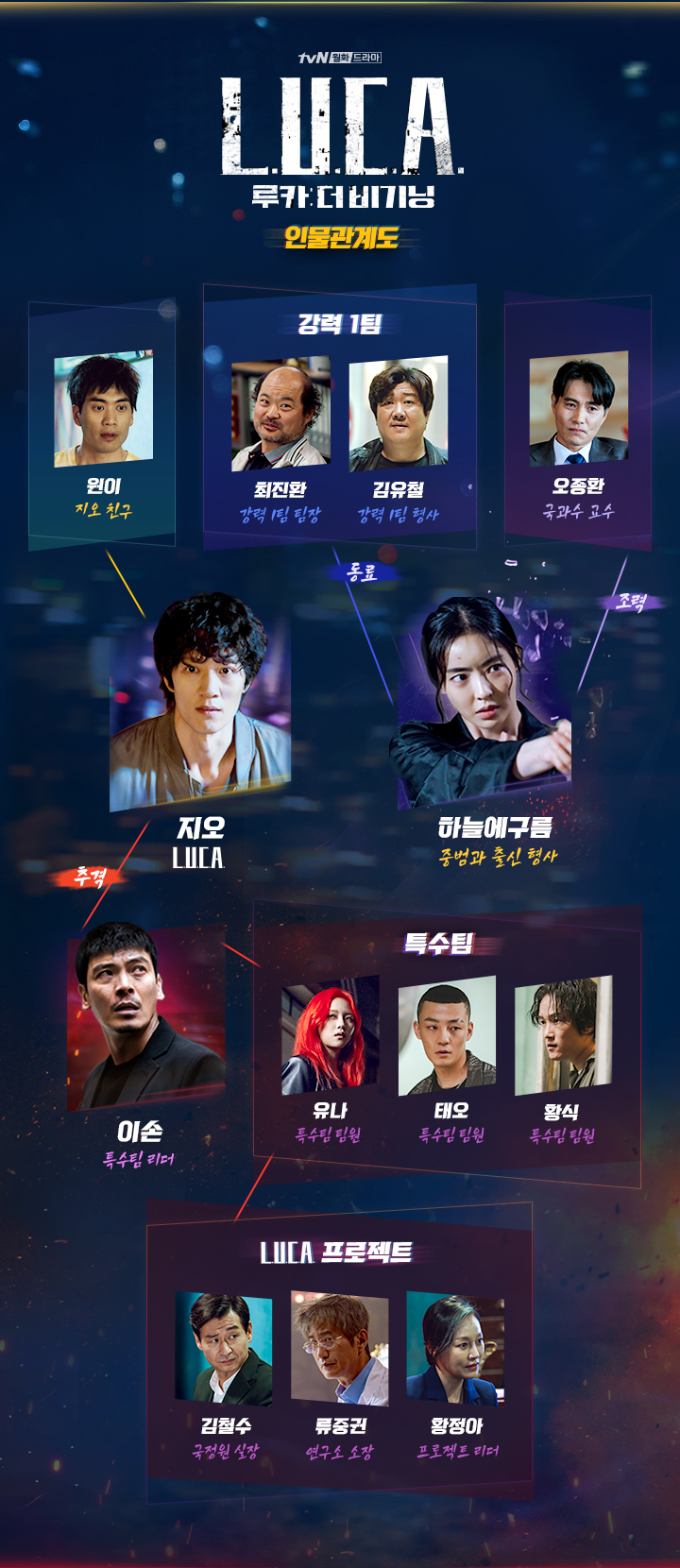 박혁권은 L.U.C.A. 프로젝트를 진행해온 국정원 숨은 실세 김철수 역을, 안내상은 L.U.C.A. 프로젝트를 유일하게 성공시킨 과학자 류중권 역을, 진경은 L.U.C.A. 프로젝트로 세상을 발 밑에 두려는 야심가 황정아 역을 맡았습니다. 김상호는 주안지방경찰청 강력 1팀 팀장이자 구름이 존경하는 사수 최진환 역을, 황재열은 주안지방경찰청 강력 1팀 팀원이자 구름의 든든한 선배 김유철 역을 맡았습니다.