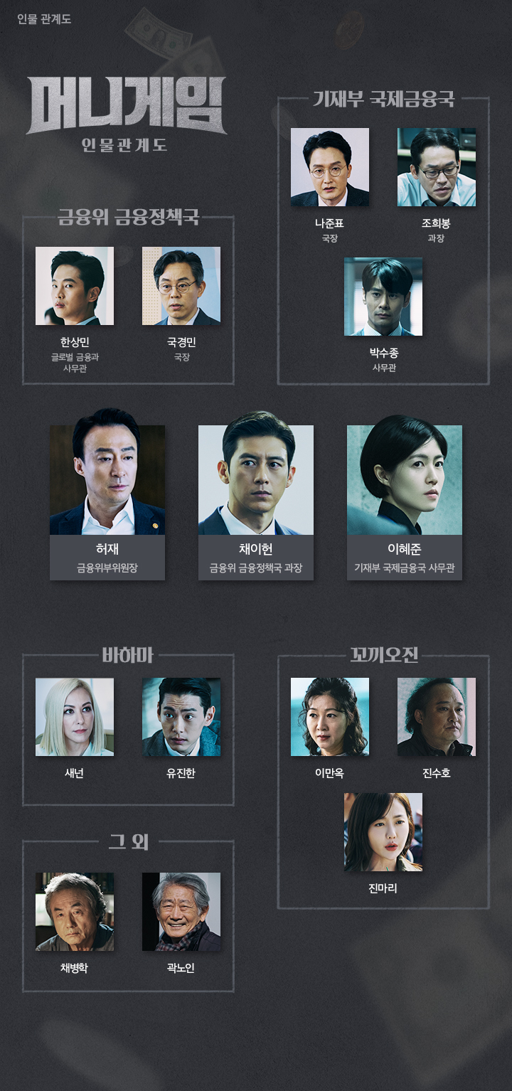 등장인물 소개 - 극중 고수는 금융위 금융정책국 과장 채이헌 역, 이성민은 금융위부위원장 허재 역, 심은경은 기재부 국제금융국 사무관 이혜준 역을 맡았습니다