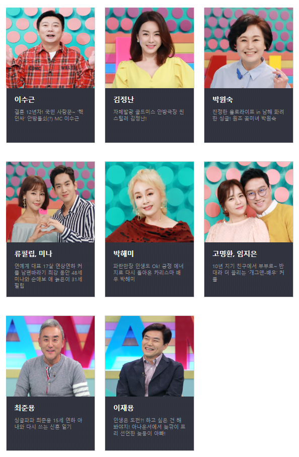 출연진 - 이수근, 김정난, 박원숙, 류필립, 미나, 박해미, 최준용, 이재용