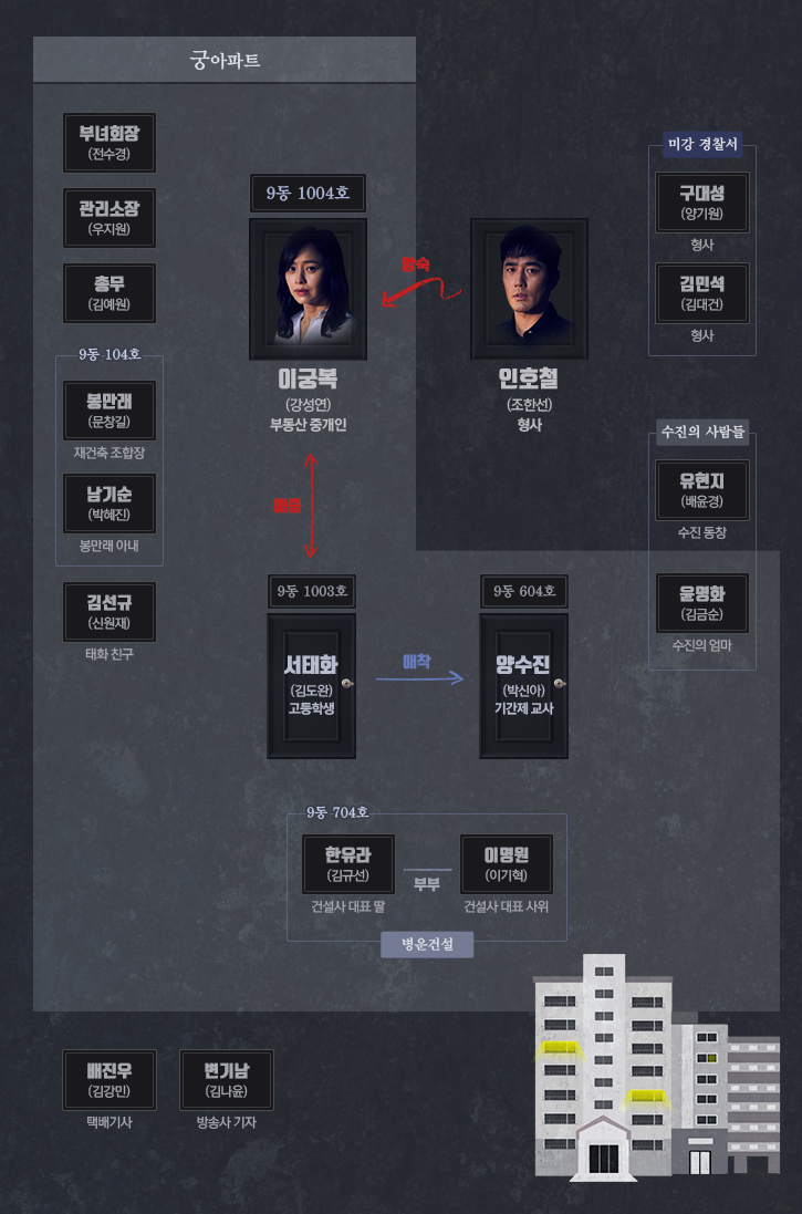 강성연은 아파트 입주민이자 부동산중개업자 이궁복 역을 맡아 용의자 중 한 사람으로 변신합니다. 조한선은 사건을 추적하는 열혈형사 인호철 역을 맡았습니다. 이 외에 박신아, 김도완, 이기혁, 김규선 등 예사롭지 않은 실력의 신예들이 출연합니다.