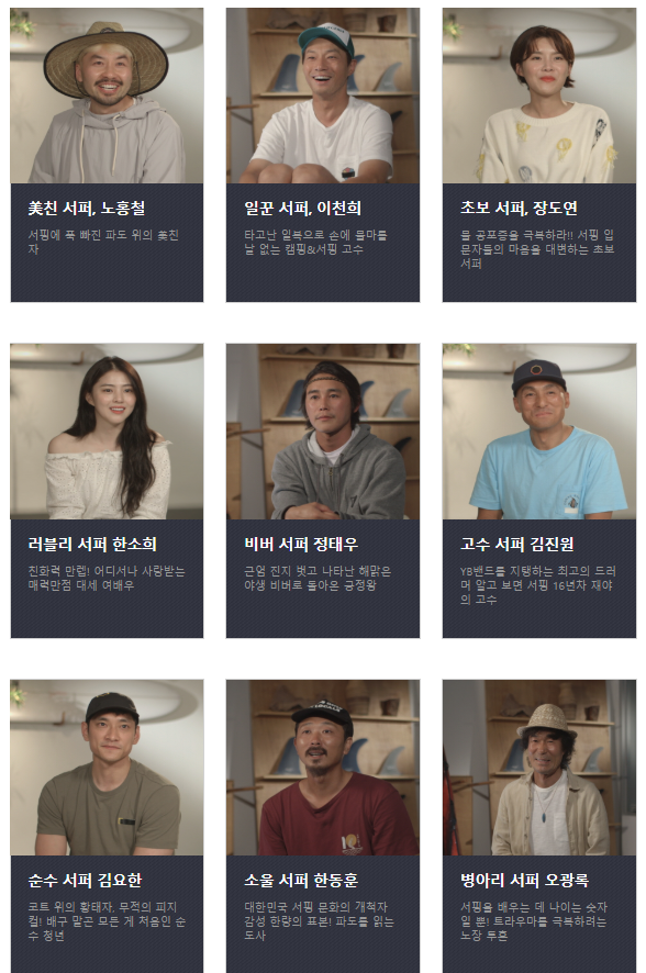 출연진으로는 방송계 대표 서퍼 배우 이천희, 개그맨 노홍철과 장도연, 배우 정태우와 한소희, 배구선수 김요한, YB밴드 드러머 김진원, 서퍼 한동훈 등 다양한 분야의 8명의 셀럽 서퍼가 출연합니다.