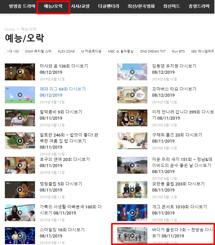 해당 사이트로 접속하면 예능/오락 메뉴가 보입니다. 이 예능/오락 메뉴로 들어가면 현재 방송되고 있는 예능 프로그램들을 재방송으로 볼 수 있도록 업데이트 되어 있습니다.