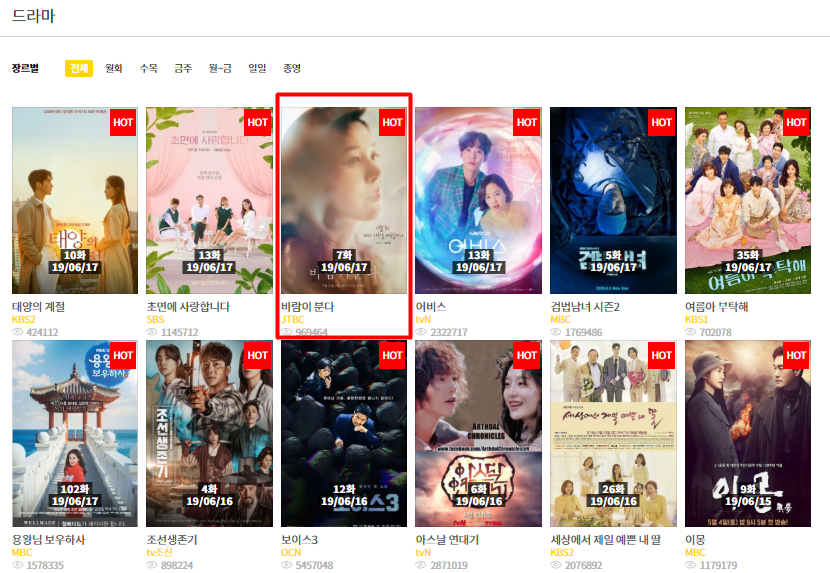 바람이분다는 현재 1페이지 상단에 위치에 있는데, 1 페이지에 해당 드라마가 보이지 않으면, 페이지를 넘기면서 찾으시면 됩니다. 페이지를 넘겨서 찾는 게 불편하신 분들은 검색창을 이용하셔서 해당 드라마를 찾으시면 됩니다.