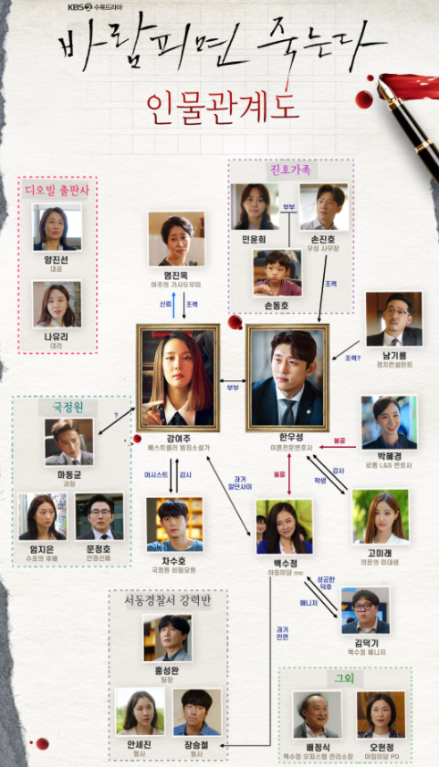 반면 우성은 다양한 사람들과 교류합니다. 변호사 사무실 사무장인 손진호에게 조력을 받는 그는 로펌 L&S 변호사 박혜경, 정치컨설턴트 남기룡과는 물음표가 그려진 관계로 궁금증을 자아냅니다. '미대 여신' 고미래는 어느 누구와도 관계가 없는 '의문의 미대생'이라고 표현돼 그녀의 정체가 호기심을 유발합니다.