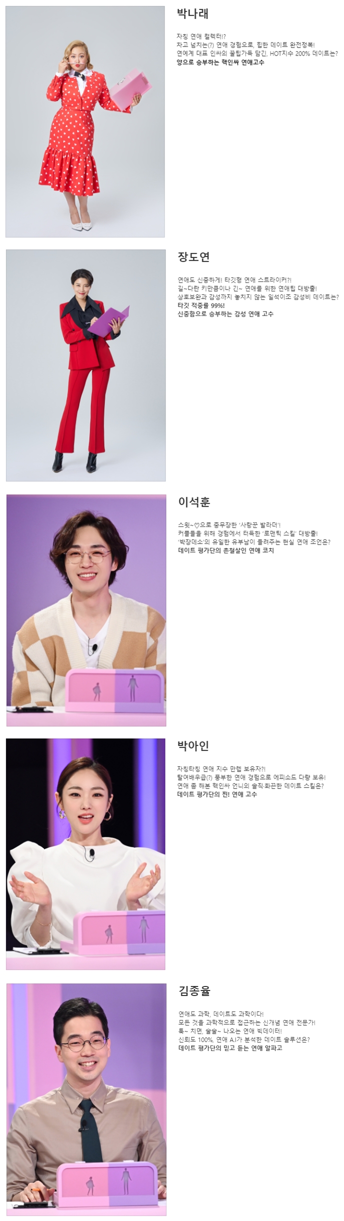 여기에 이석훈과 박아인, 김종율로 이뤄진 '데이트 평가단'이 합류해 박나래, 장도연이 설계한 데이트 코스를 객관적으로 평가를 하는데요, 데이트 평가단'은 현실 연애 조언부터 흥미진진한 연애 '썰', 데이트 노하우까지, 데이트에 대한 다양한 정보를 제공, 재미를 더할 예정입니다.