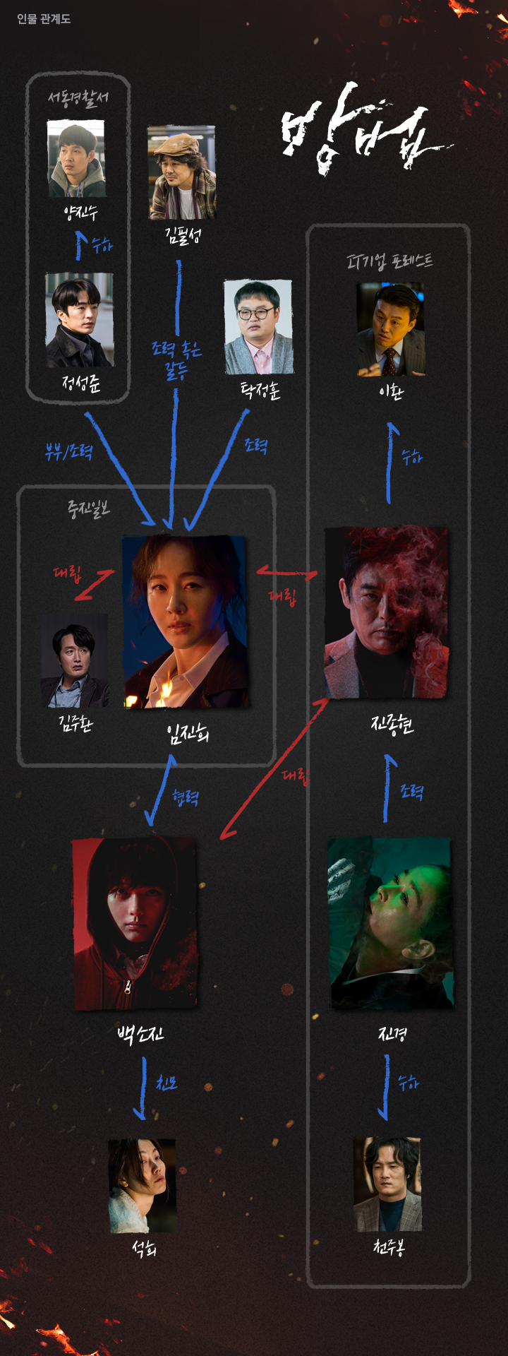 등장인물 소개 - 임진희는 흑막을 파헤치기 위해 서동경찰서 강력1팀장이자 남편 정성준(정문성), 후배 양진수(김도윤) 경찰의 도움으로 인간의 탈을 쓴 악귀 진종현(성동일)을 추적합니다. 특히 이 과정에서 임진희와 대립 관계에 있는 선배 기자 김주환(최병모)이 등장하면서 임진희가 올곧은 신념을 버리고 악과 손을 잡는데 일조해 어떤 사건이 시작될지 궁금증을 자아냅니다