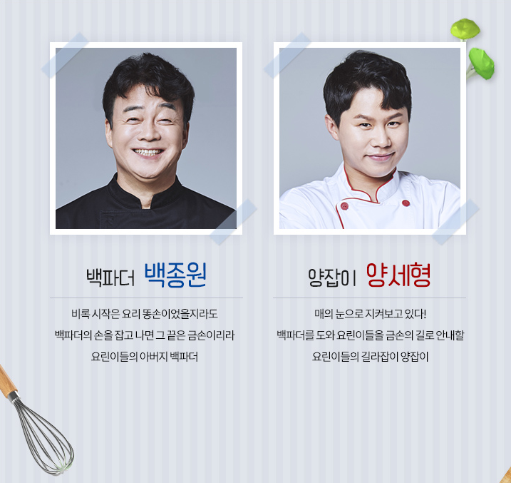 음식 분야 가장 '핫'한 외식사업가 백종원과 개그맨 양세형이 출연하며, '쌍방향 소통' 요리쇼를 표방하는데요. 매주 초 간단 재료와 누구나 갖고 있는 요리도구로 사람들을 요리의 세계로 안내합니다. 요리에 참여할 '왕초보 요린이'들은 공개 모집합니다.