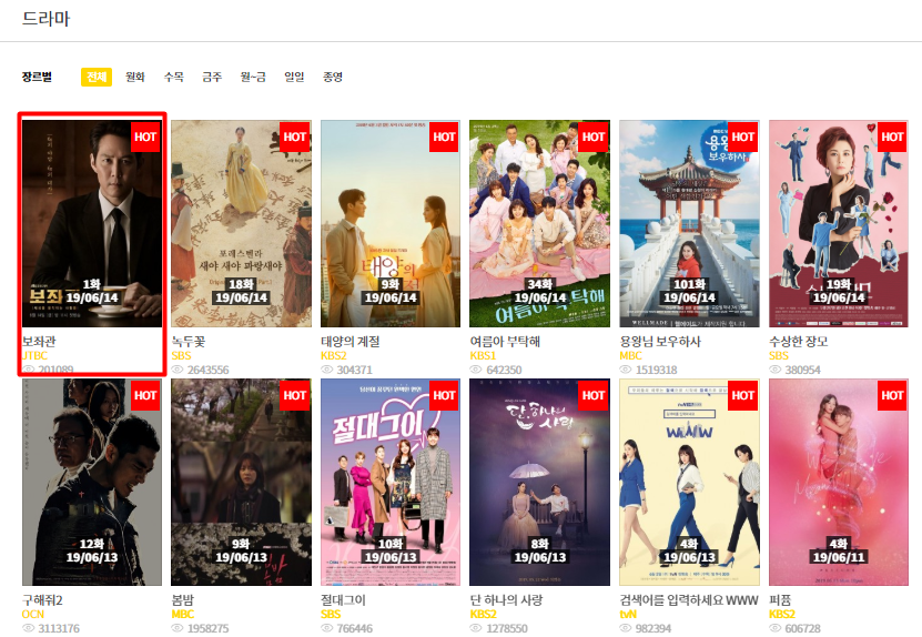 해당 사이트 메인 화면에서 보시면, 카테고리 메뉴를 누르면, 드라마 메뉴가 나옵니다. 드라마 메뉴로 들어가면 현재 방송되고 있는 드라마들이 업데이트 되어 있습니다.