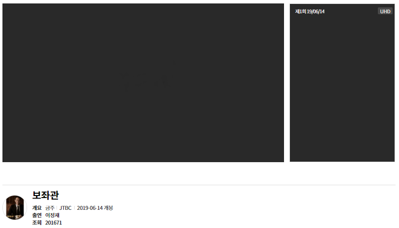 페이지를 넘겨서 찾는 게 불편하신 분들은 검색창을 이용하셔서 해당 드라마를 찾으시면 됩니다. 검색창에 드라마 제목 '보좌관'을 입력하시고 검색버튼을 누르시면 해당드라마가 검색이 됩니다. 최근 방송된 1회를 눌러서 시청해봤는데, 괜찮은 화질로 시청 할 수 있었습니다. 하단을 참조하여 해당 드라마를 시청하시기 바랍니다.