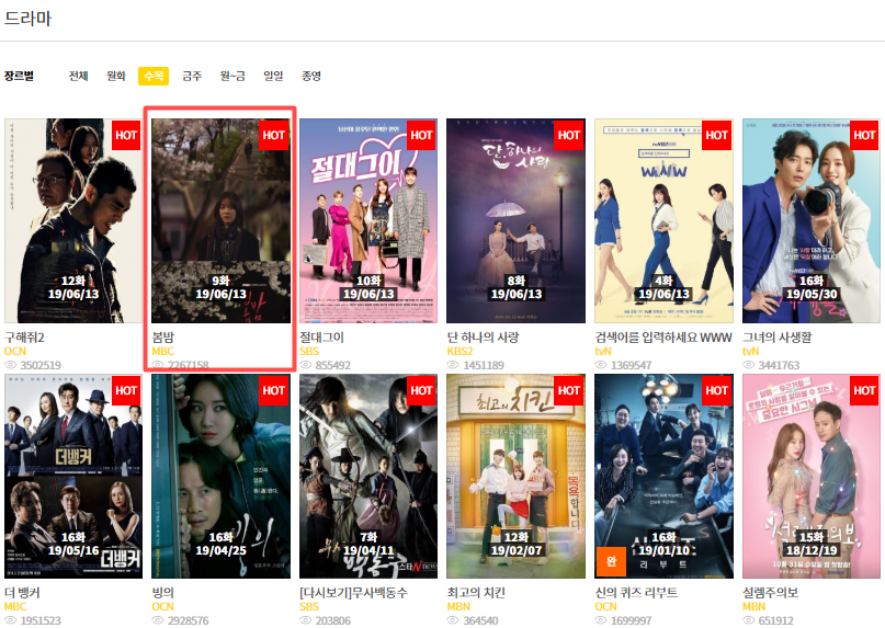 봄밤은 현재 1페이지 상단에 위치해 있습니다. 알려드린 페이지에 해당 드라마가 없으면 다음 페이지를 넘기면서 찾으시면 됩니다. 페이지를 넘겨서 찾는 게 불편하신 분들은 검색창을 이용하셔서 해당 드라마를 찾으시면 됩니다.
