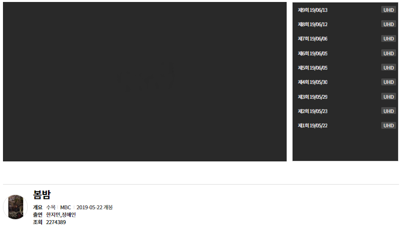 검색창을 이용하여 드라마 제목 '봄밤'을 입력하시고 검색버튼을 누르시면 해당드라마가 검색이 됩니다. 6월 13일자 9회를 눌러서 시청해봤는데, 제법 괜찮은 화질로 볼 수 있었습니다. 아래를 참조하여 정해인과 한지민의 로맨스 봄밤을 시청하시기 바랍니다.