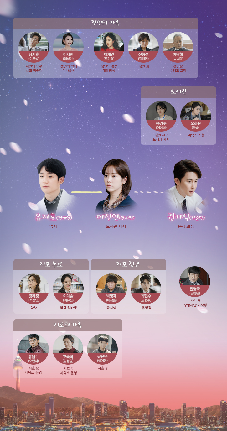한지민은 도서관 사서 이정인 역, 정해인은 약사 유지호 역을 맡았습니다. 이정인의 남자친구 권기석 역은 김준한이 맡아 활약 중입니다.