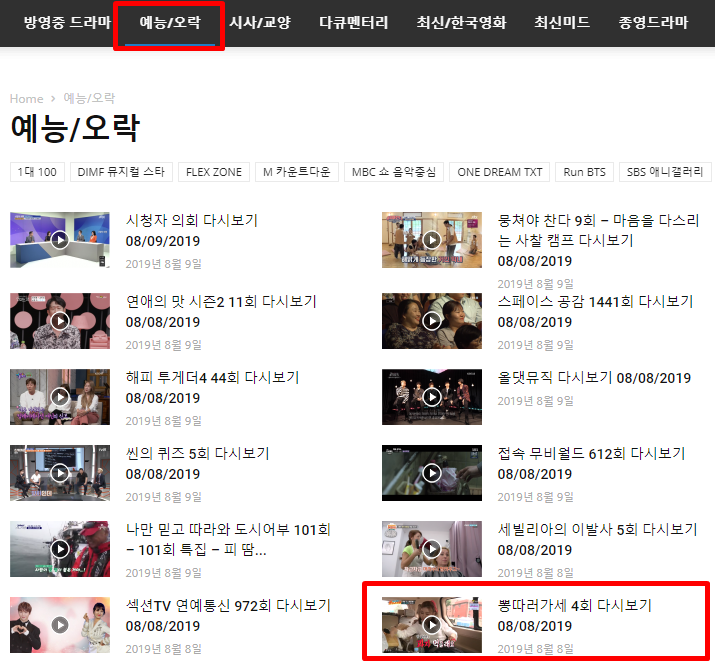 본 사이트로 접속하시면 메인 화면에 예능/오락 메뉴가 있습니다. 이 메뉴를 눌러서 들어가면 현재 방송되고 있는 예능 프로그램들이 업데이트 되어 있습니다.