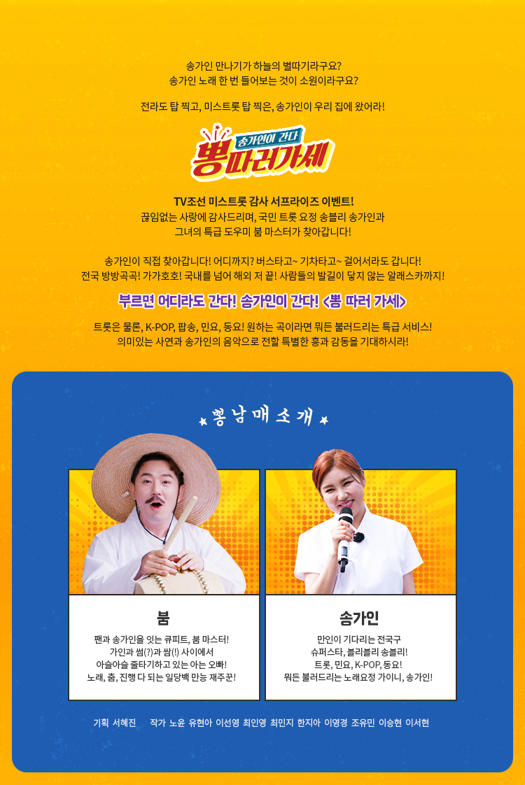 TV조선 예능 프로그램 송가인이 간다 뽕따러가세는 송가인이 접수된 시청자들의 사연과 신청곡에 따라, 본인 혹은 가족, 연인, 친구, 직장동료 등 사연의 주인공에게 직접 찾아가 특별한 노래를 선물해주는 리얼리티 프로그램입니다. 본방송을 놓치신 분들은 포스팅 하단을 참조하세요