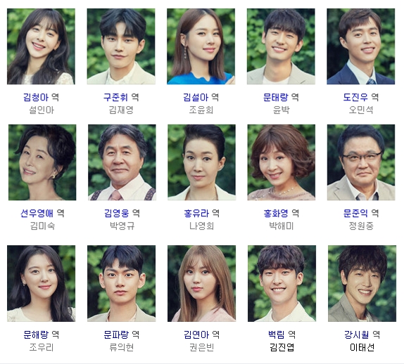 김창아 역에 설인아, 구준휘 역에 김재영, 김설아 역에 조윤희, 문태랑 역에 윤박, 도진우 역에 오민석, 선우영애 역에 김미숙, 김영웅 역에 박영규, 홍유라 역에 나영희, 홍화영 역에 박해미등이 출연합니다.