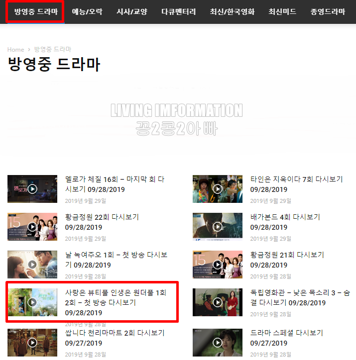 알려드린 사이트로 접속하면, 카테고리에 방영중인 드라마 메뉴가 있습니다. 이 드라마 메뉴로 들어가면 현재 방송되고 있는 드라마들이 업데이트 되어 있습니다.