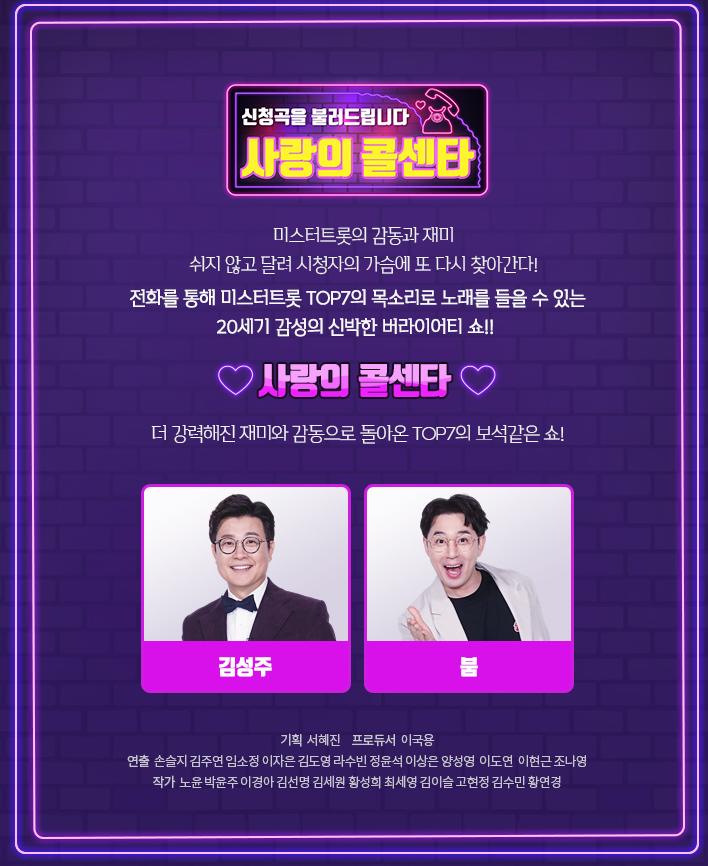 '사랑의 콜센타'는 '미스터트롯' 최종 결승 진출자 7명이 특정 시간안 전국 각지에서 걸려온 전화를 통해 신청자의 사연과 신청곡을 받은 후 즉석에서 신청곡을 불러 주는 실시간 전화 노래방 형식의 예능 프로그램이다. MC 김성주와 붐이 진행을 맡습니다. 사랑의콜센타 본방을 시청 못하신 분들은 무료방송TV다시보기 통해서 시청가능합니다